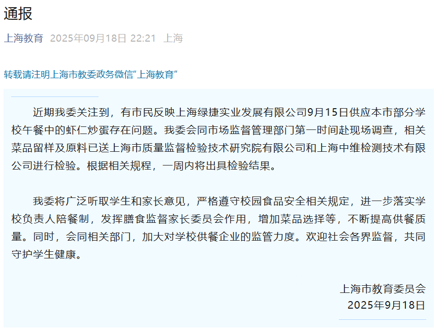 近期我委关注到,有市民反映上海绿捷实业发展有限公司9月15日供应本市部分学校午餐中的虾仁炒蛋存在问题。我委会同市场监督管理部门第一时间赴现场调查,相关菜品留样及原料已送上海市质量监督检验技术研究院有限公司和上海中维检测技术有限公司进行检验。根据相关规程,一周内将出具检验结果。