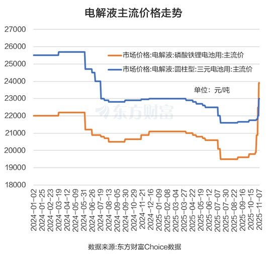 从近期的市场数据来看,电解液、六氟磷酸锂正经历明显的价格上涨。隆众资讯的数据显示,11月7日磷酸铁锂电池用电解液的价格为2.39万元/吨,和7月中下旬、8月份的1.95万元/吨相比,大幅上涨22.56%。圆柱形三元电池用电解液的价格为2.3万元/吨,和7月中下旬、8月份的2.16万元/吨相比,价格上涨6.48%。