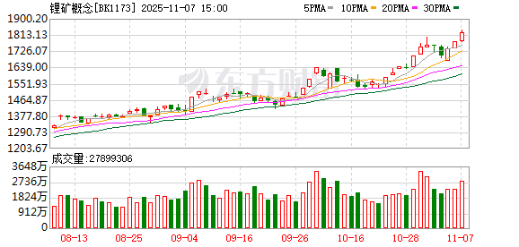 受六氟磷酸锂、硫化锂等题材大涨的提振,11月7日锂矿概念板块走强,收盘时盛新锂能、海南矿业涨停;德方纳米大涨超10%;大中矿业、国城矿业、永兴材料等也涨幅靠前。