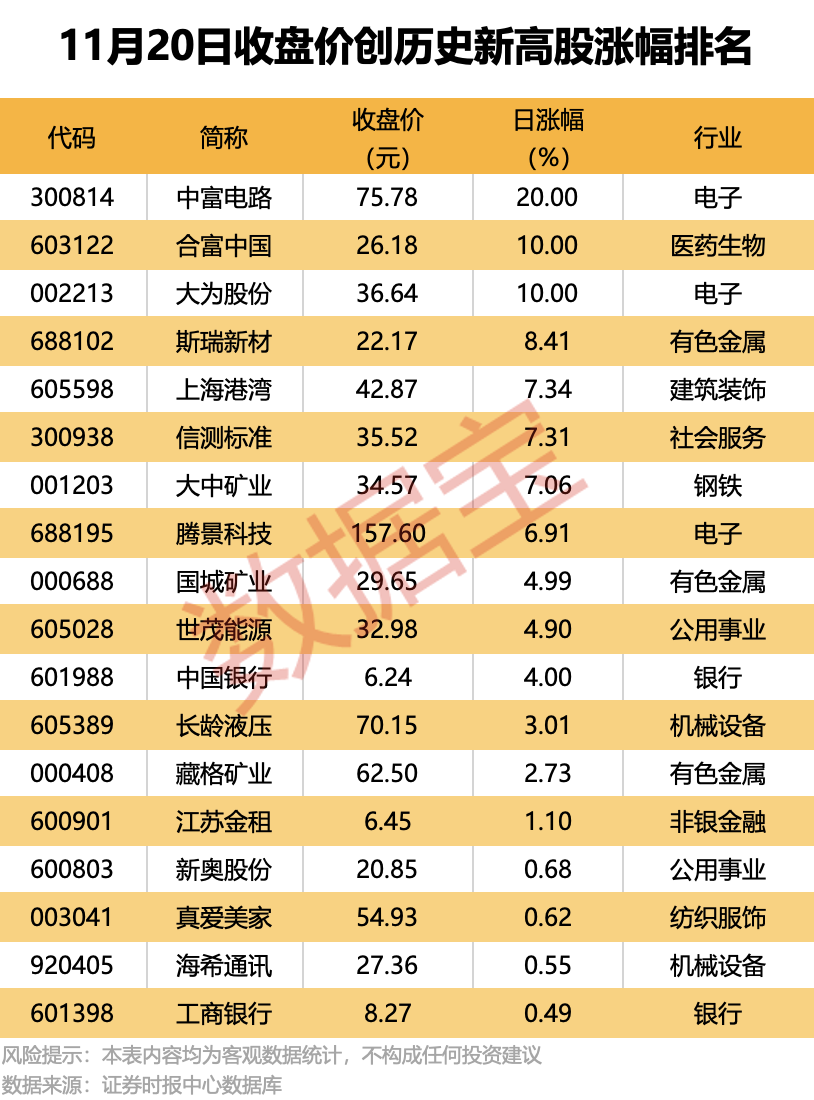 收盘价创历史新高股中,今日股价平均上涨5.56%,涨停的有中富电路、合富中国、大为股份,涨幅居前的有斯瑞新材、上海港湾、信测标准等。
