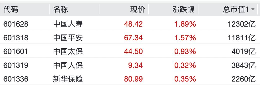 保险股全线飘红,中国人寿、中国平安涨超1%,中国太保、中国人保、新华保险均上涨。