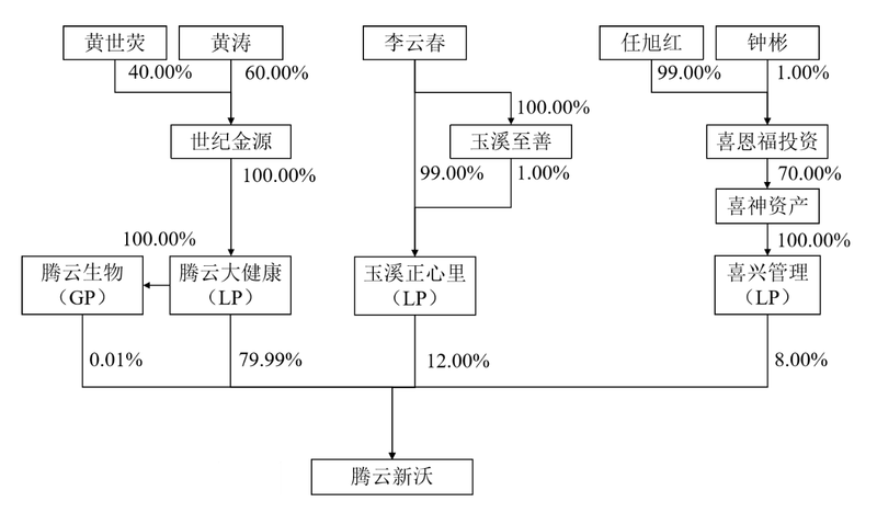 腾云新沃成立于2026年2月,其产权控制关系显示,腾云新沃主要资金来自腾云大健康,而腾云大健康由世纪金源100%出资。