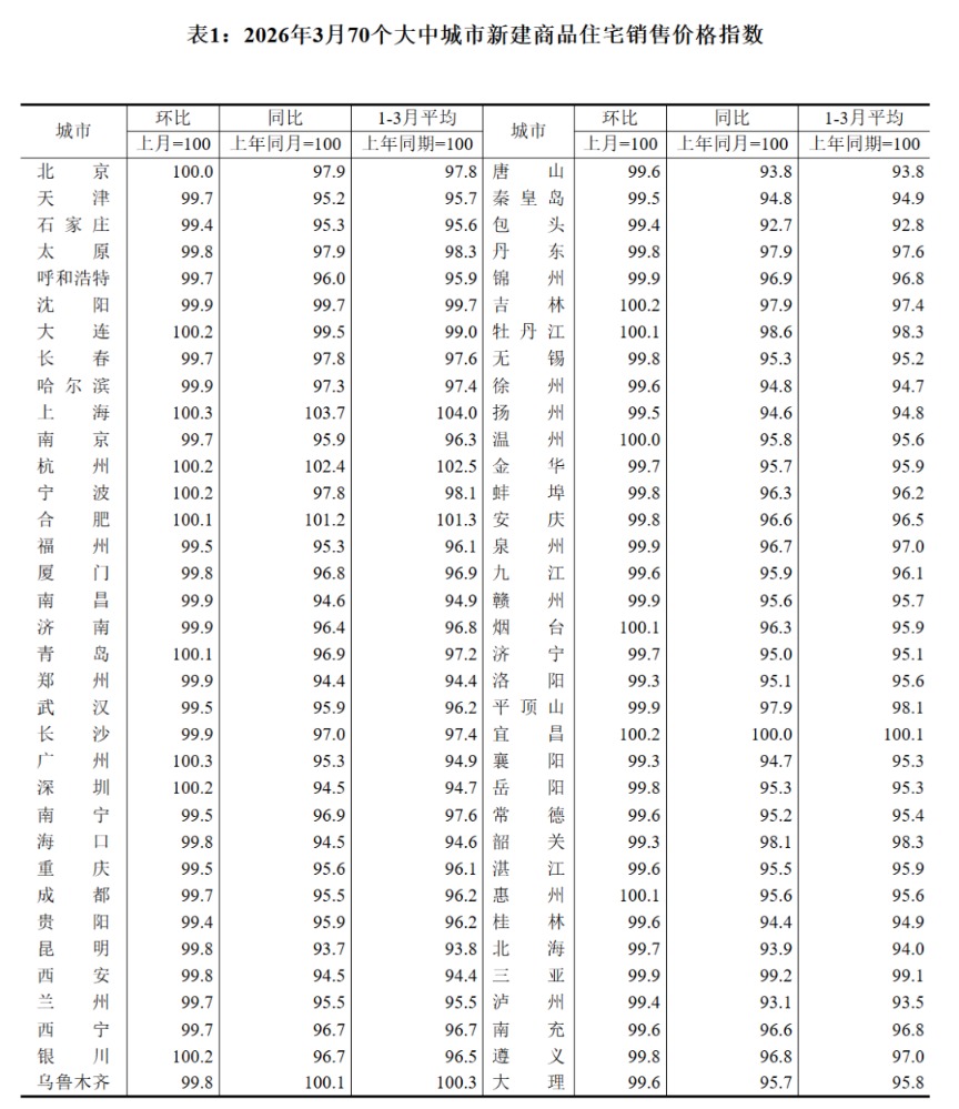 【导读】国家统计局公布2026年3月份70个大中城市商品住宅销售价格变动情况