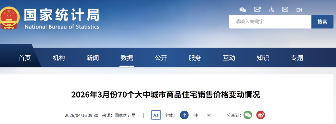 4月16日上午,国家统计局公布2026年3月份70个大中城市商品住宅销售价格变动情况。